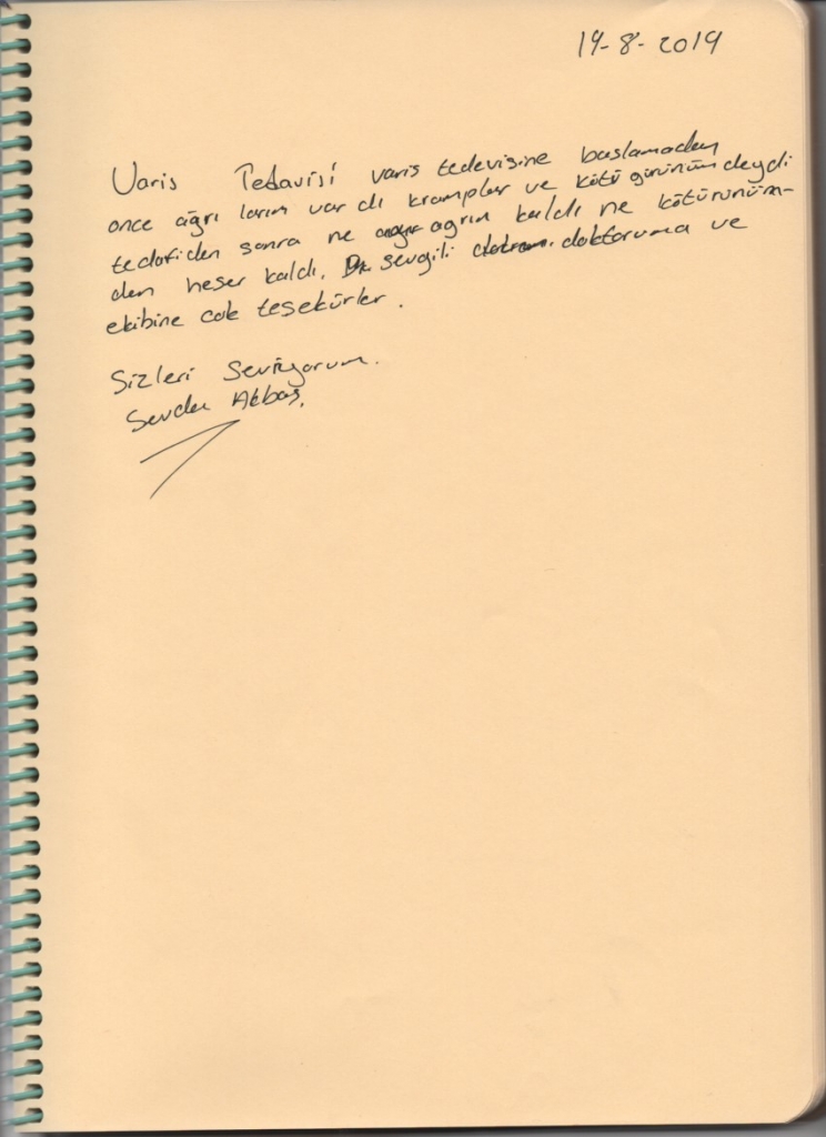 Varis tedavisine başlamadan önce ağrılarım vardı. Kramplar ve kötü görünümdeydi. Ameliyatsız varis tedavisi işleminden sonra ne ağrım kaldı ne kötü görünümden eser kaldı. Sevgili doktoruma ve ekibine spnsuz teşekkürler.